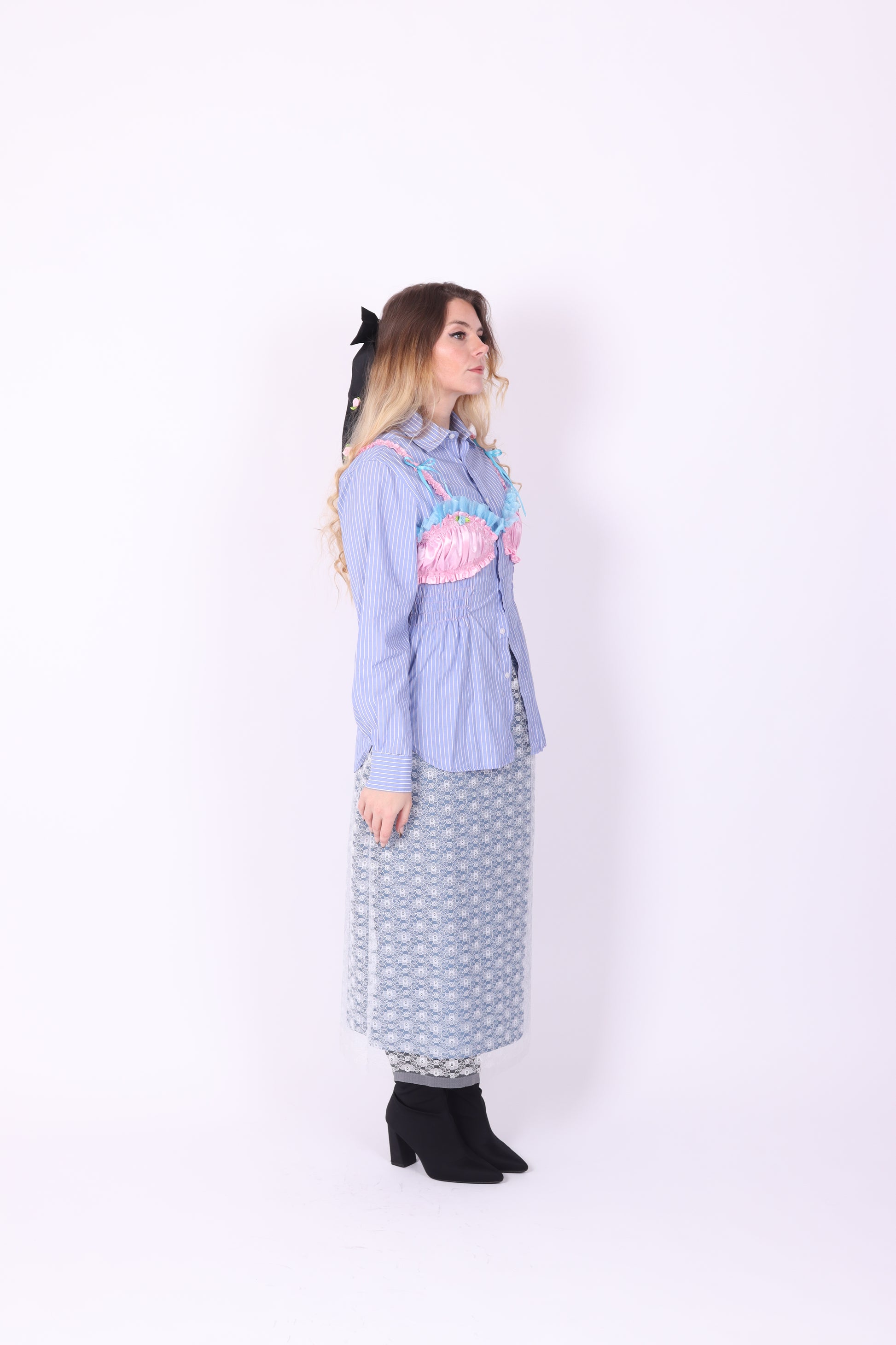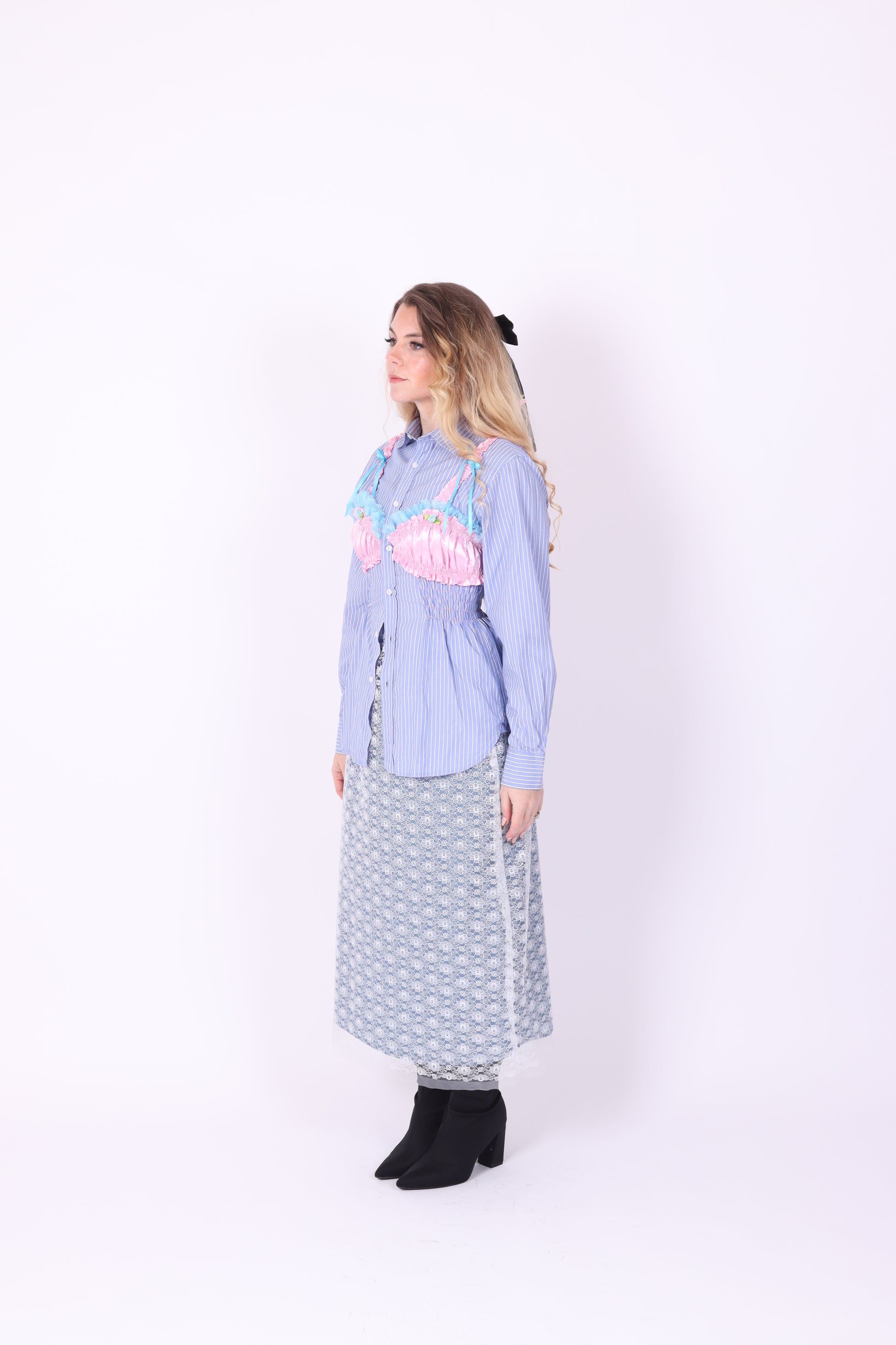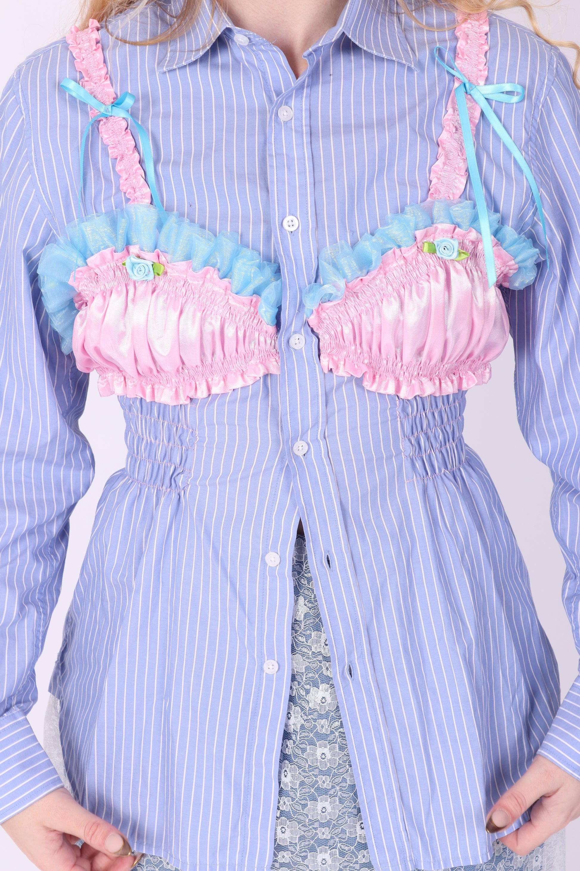 Delta Of Phoenix rework shirt in blue with white pinstripe with baby pink taffeta bralette applique, sky blue organza ruffle and blue rosette detailing. One of a kind rework preloved shirt, soft cotton with pink topstitch detail at waist. Created using locally sourced luxury fabrics, each shirt is one of a kind, unique and resewn with love at Delta HQ, London by Francesca Newman.✧ FULL SHIRT MEASUREMENTS WITH BUTTONS DONE UP: BUST - 38' || WAIST - 32' || HIP - 40'
