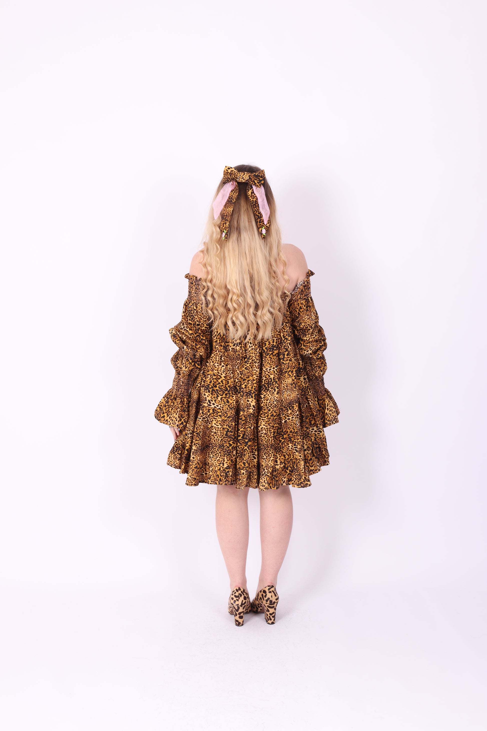 Luxury leopard print mini puff dress, with long puff sleeves. Five gathered tiers of luxury leopard cotton to create a mini flared silhouette, elasticated shirring at chest and cuff and baby pink bow detail. Created over 6 hours, using locally sourced luxury fabrics, each order is handmade with love at Delta HQ, London by Francesca Newman.