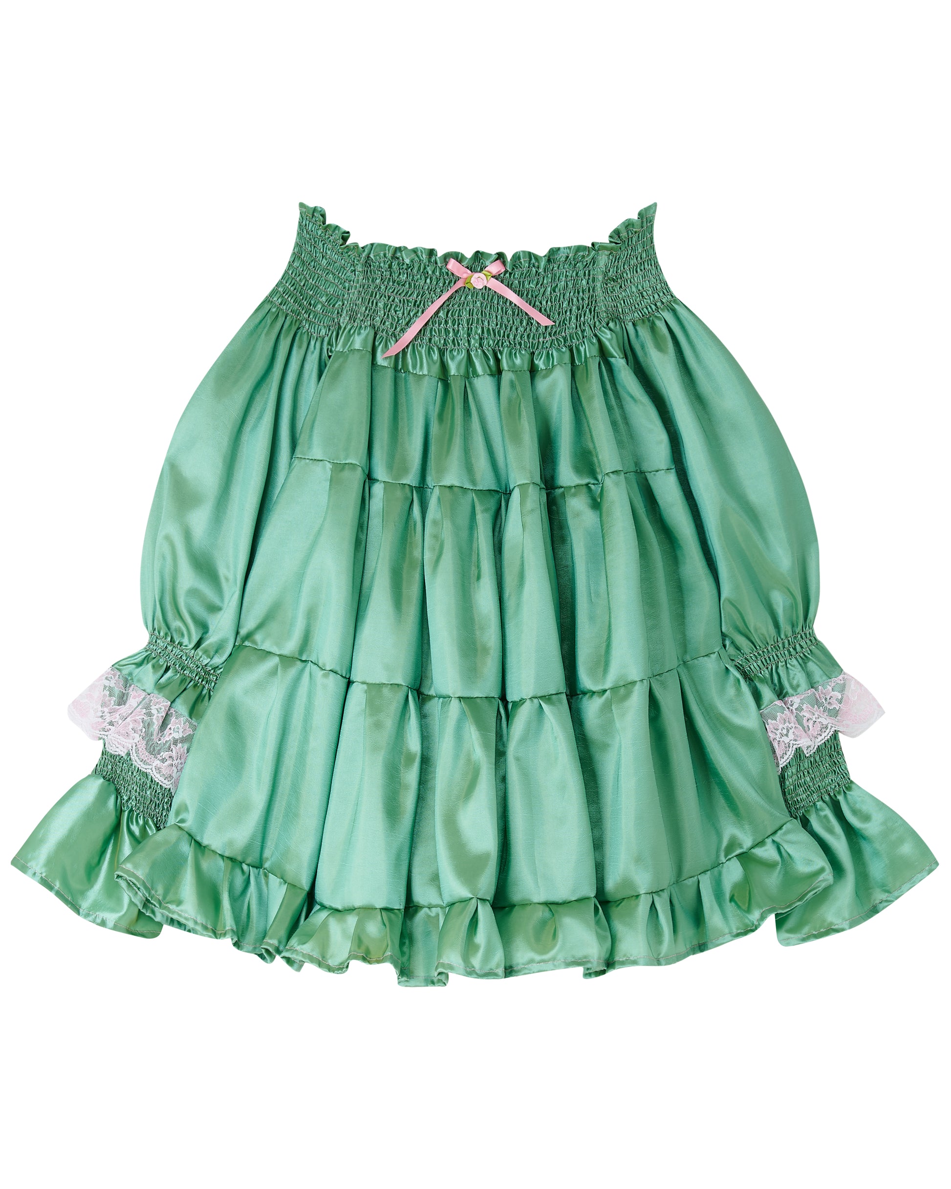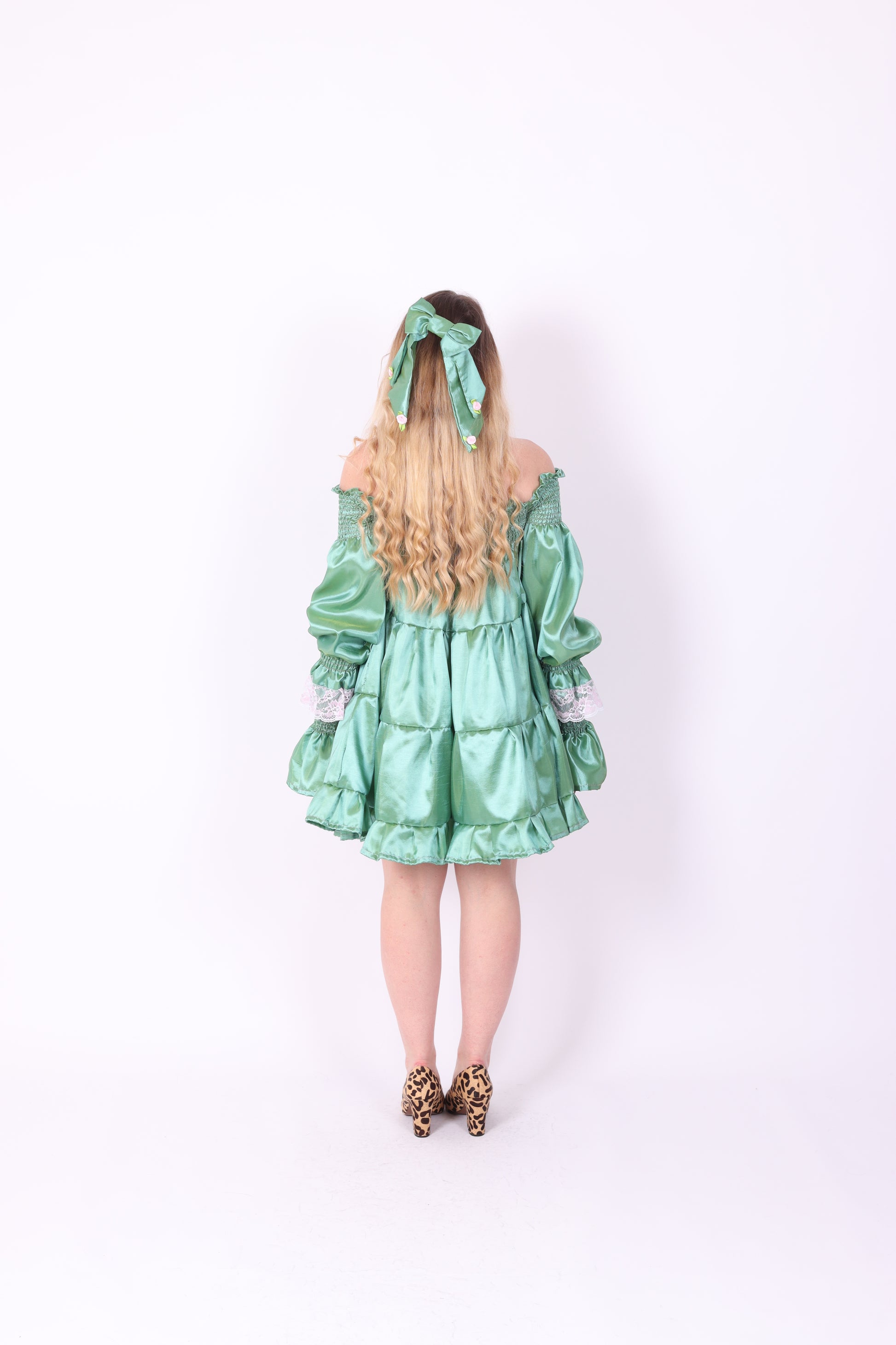 Luxury pistachio green taffeta mini puff dress, with long puff sleeves. Five gathered tiers of luxury pistachio green taffeta to create a mini flared silhouette, elasticated shirring at chest and cuff and pink bow detail, with lace detail at puff sleeve cuff. Created over 6 hours, using locally sourced luxury fabrics, each order is handmade with love at Delta HQ, London by Francesca Newman.