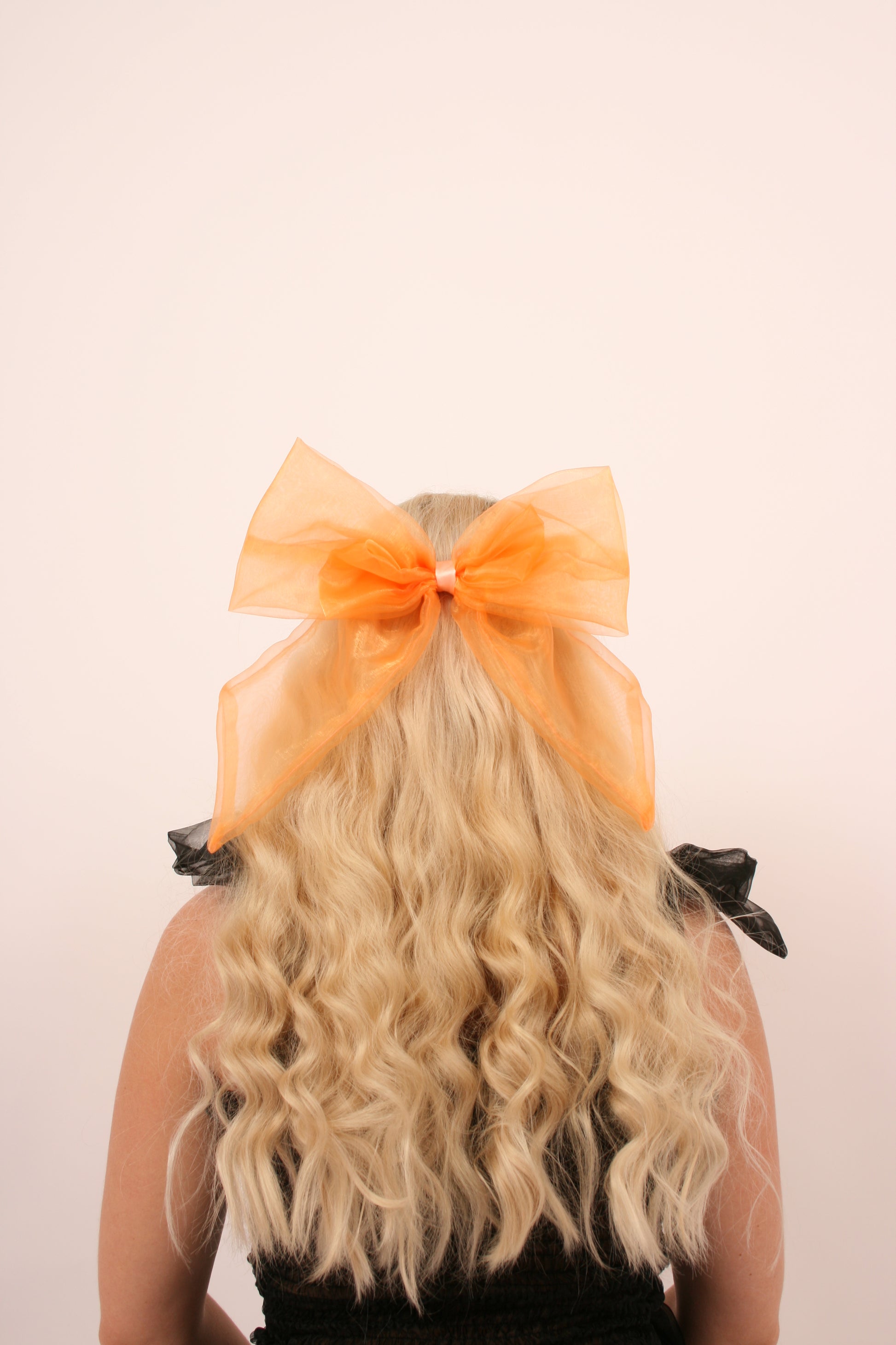Dreamy XL luxury orange organza bow, fastened with a detachable silver 9cm silver crocodile clasp. Created using locally sourced luxury fabrics, each order is handmade with love at Delta HQ, London by Francesca Newman.