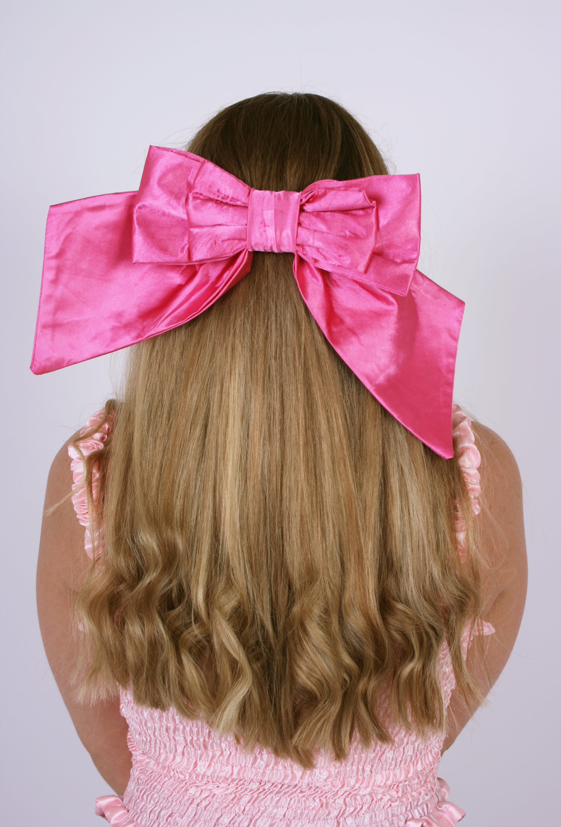 Dreamy XL luxury fuchsia pink silk bow, fastened with a detachable silver 9cm silver crocodile clasp - Created using locally sourced luxury fabrics, each order is handmade with love at Delta HQ, London by Francesca Newman.