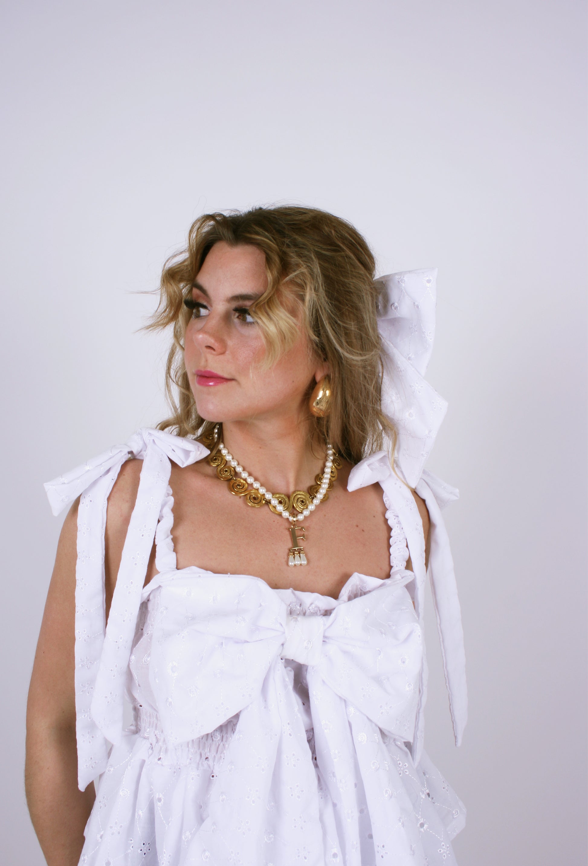 Dreamy XL luxury white broderie anglaise bow, fastened with a detachable silver 9cm silver crocodile clasp. Double layer luxury organza, the cutest look when worn with the beaut GYPSY Bow Top - Created using locally sourced luxury fabrics, each order is handmade with love at Delta HQ, London by Francesca Newman.