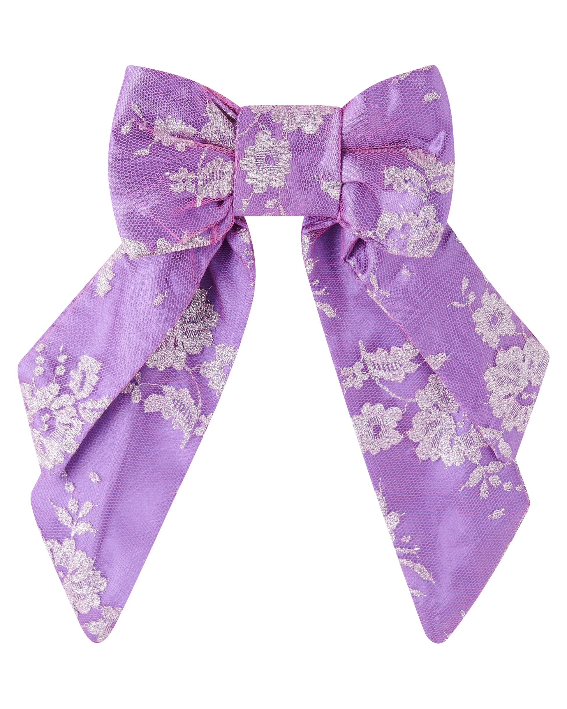 Coquette luxury bow, in metallic lace over purple silk, with double tail detail. Fastened with a detachable silver 9cm silver crocodile clasp. Created using locally sourced luxury fabrics, each order is handmade with love at Delta HQ, London by Francesca Newman.