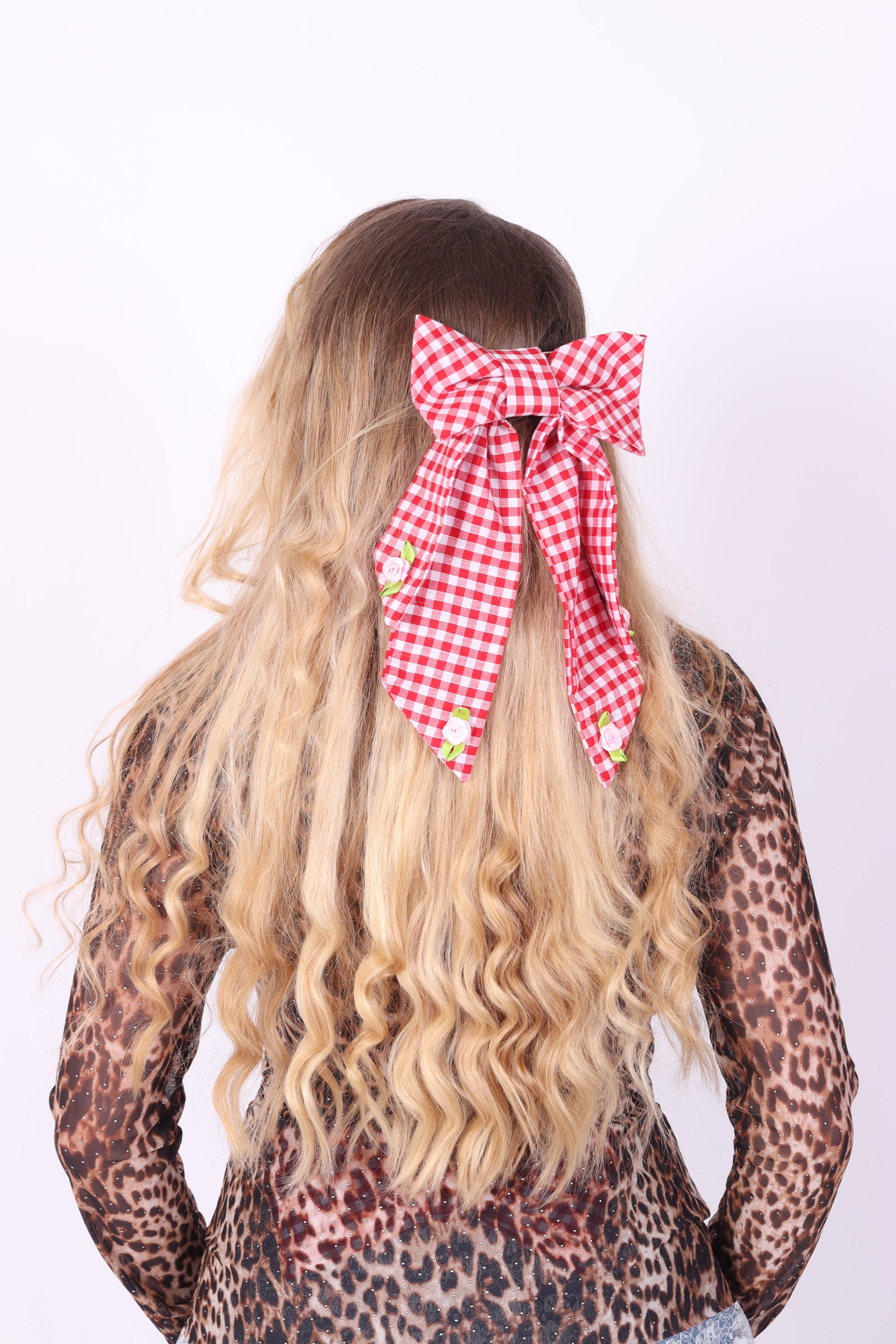 Coquette luxury red gingham bow, with double tails and pink rosette detail. Fastened with a detachable silver 9cm silver crocodile clasp. Created using locally sourced luxury fabrics, each order is handmade with love at Delta HQ, London by Francesca Newman.