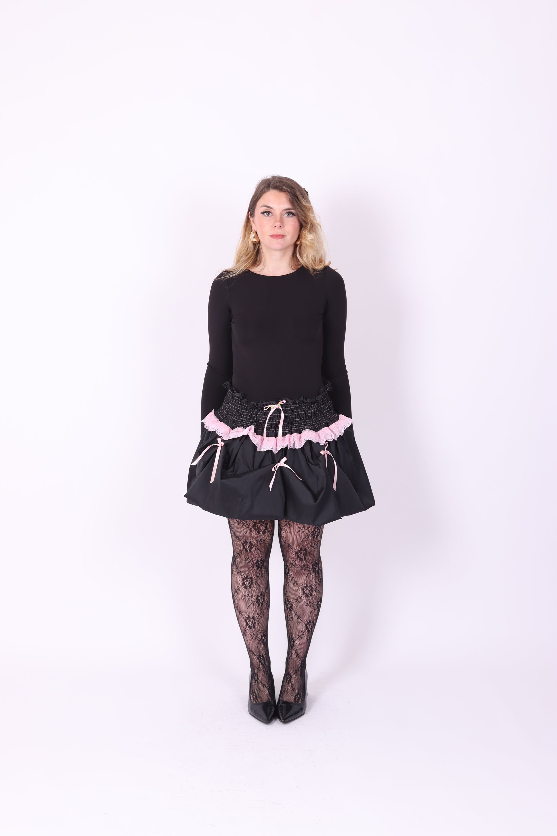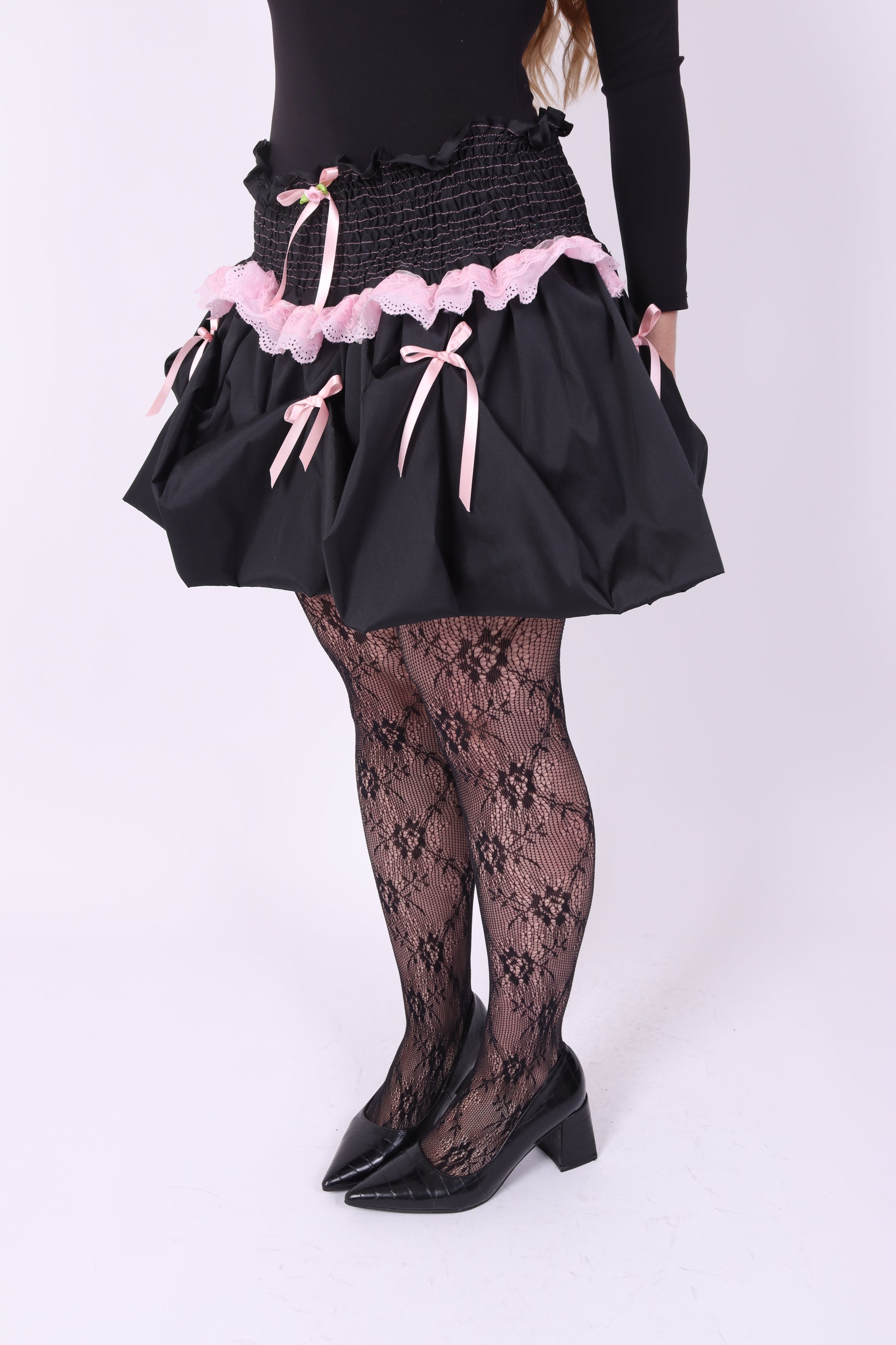 Dreamy bubble mini skirt in luxury black taffeta with baby pink bow detailing and bubblegum pink lace trim. Versatile elasticated shirring panel with pink thread topstitch, so the Dahlia Bubble Skirt can be styled both high waist and low hip, fitting your beaut unique body perfectly. Created over 5 hours, using locally sourced luxury fabrics, each order is handmade with love at Delta HQ, London by Francesca Newman.