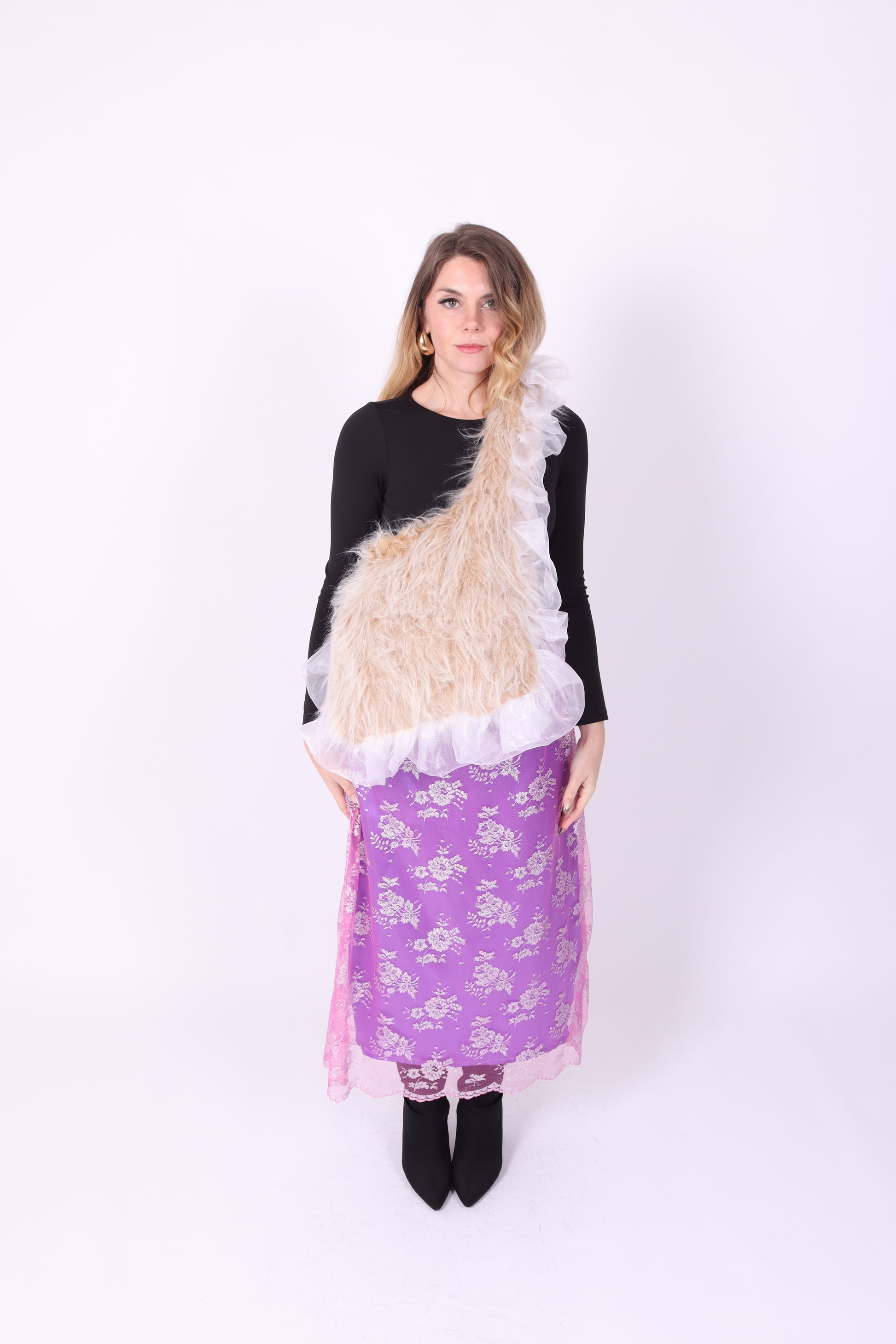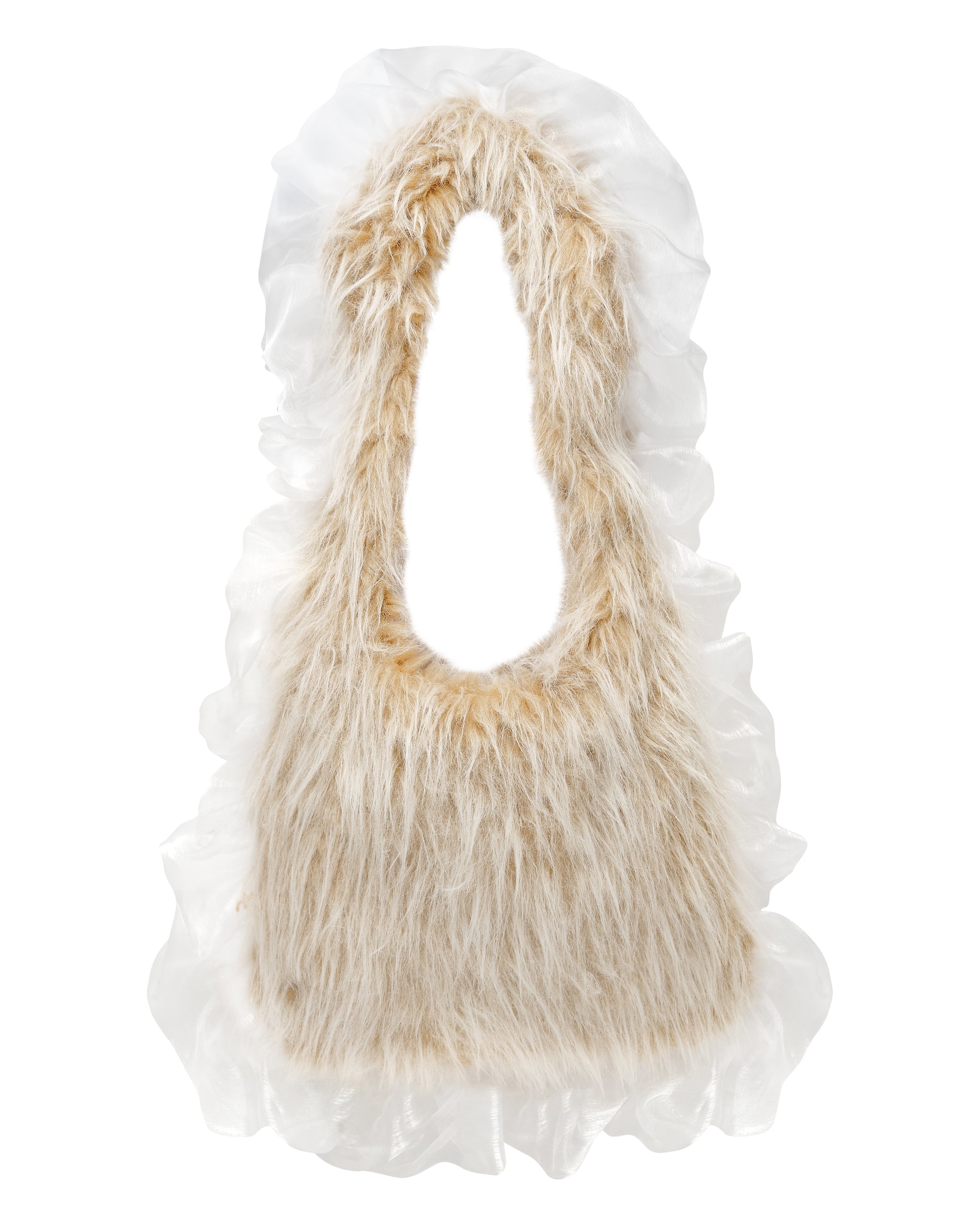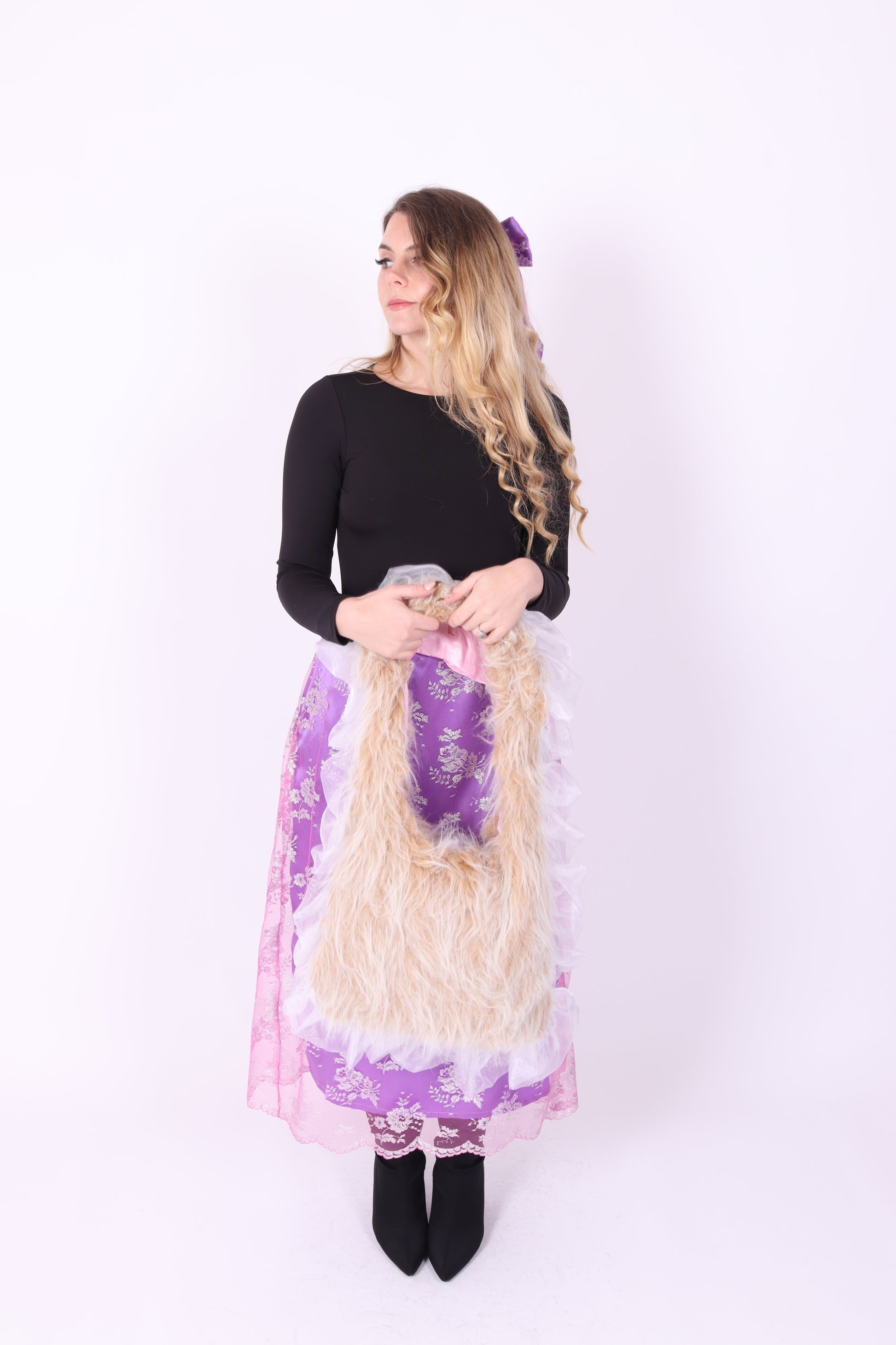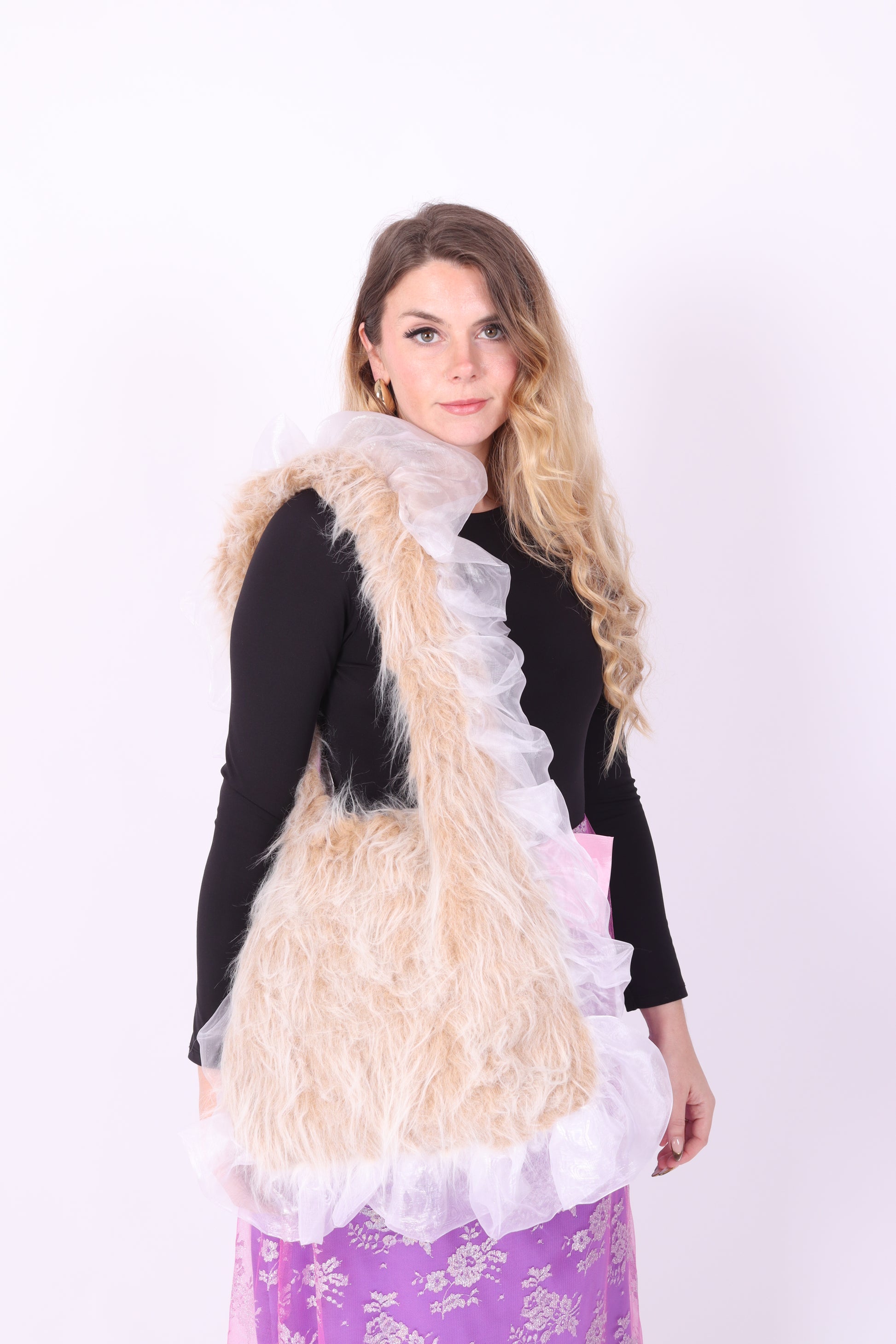 The most gorg fluffy Del Rey Tote Bag, created in white tip beige long hair faux fur with white organza ruffle detail. Fully lined in pink, one strap design. Created over 4 hours, using locally sourced luxury fabrics, each order is handmade with love at Delta HQ, London by Francesca Newman.