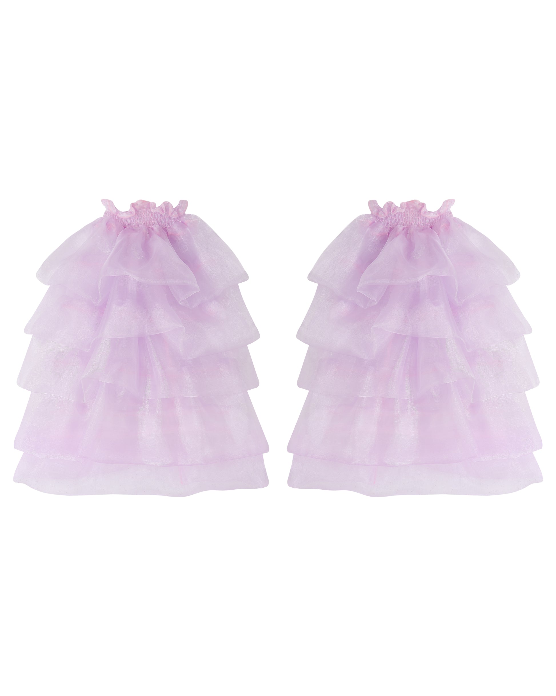 The dreamiest versatile accessory, Delta Of Phoenix Ruffles of dreams. Five tiers of ruffled luxury lilac purple organza, can be styled as leg ruffles or sleeves. Elasticated at top tier, for the most comfortable and wearable fit. Created over 3 hours, using locally sourced luxury fabrics, each order is handmade with love at Delta HQ, London by Francesca Newman.