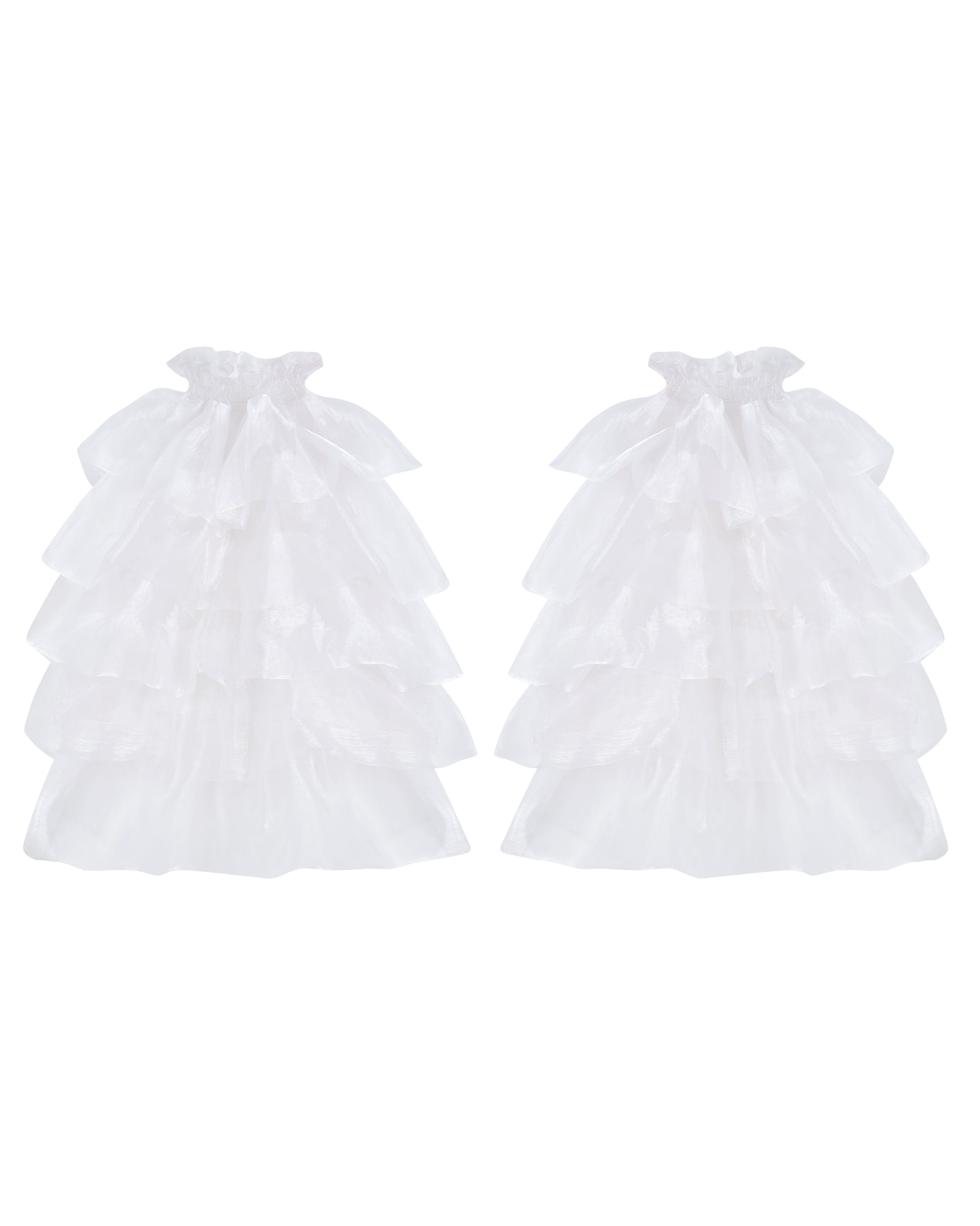 The dreamiest versatile accessory, Delta Of Phoenix Ruffles of dreams. Five tiers of ruffled luxury white organza, can be styled as leg ruffles or sleeves. Elasticated at top tier, for the most comfortable and wearable fit. Created over 3 hours, using locally sourced luxury fabrics, each order is handmade with love at Delta HQ, London by Francesca Newman.