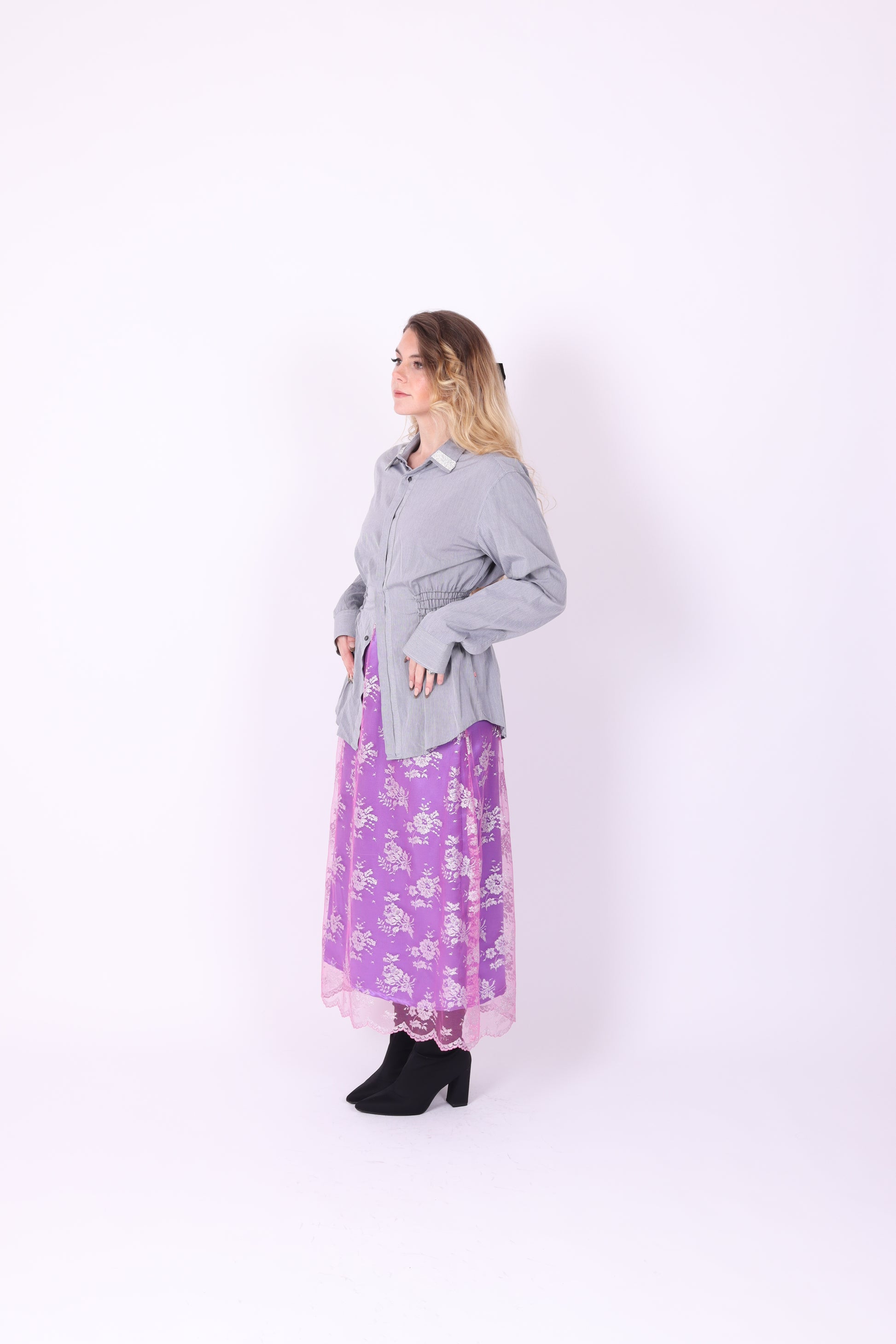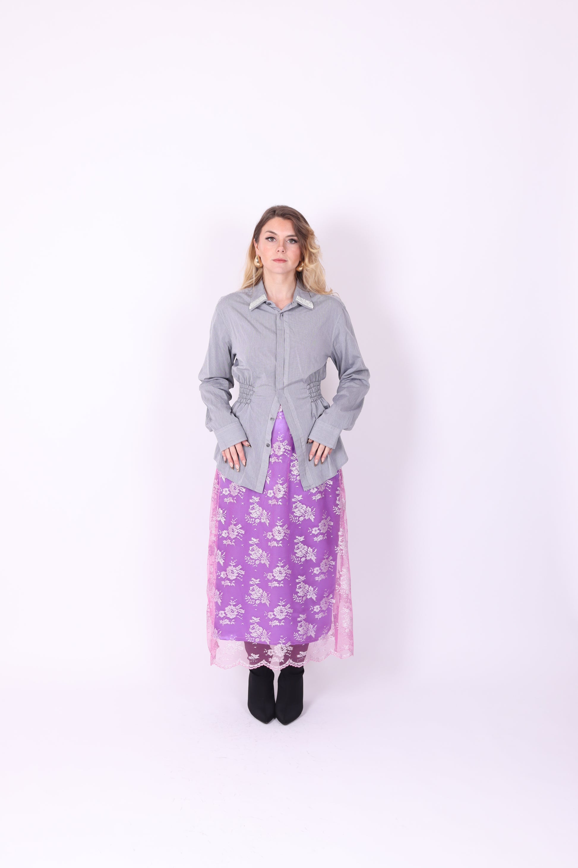 Delta Of Phoenix rework shirt in grey with black pinstripe, and beaut diamante detail on collar. One of a kind rework preloved Boss shirt, soft cotton with black topstitch detail at waist. Created using locally sourced luxury fabrics, each shirt is one of a kind, unique and resewn with love at Delta HQ, London by Francesca Newman.✧ FULL SHIRT MEASUREMENTS WITH BUTTONS DONE UP: BUST - 42' || WAIST - 42' || HIP - 44'