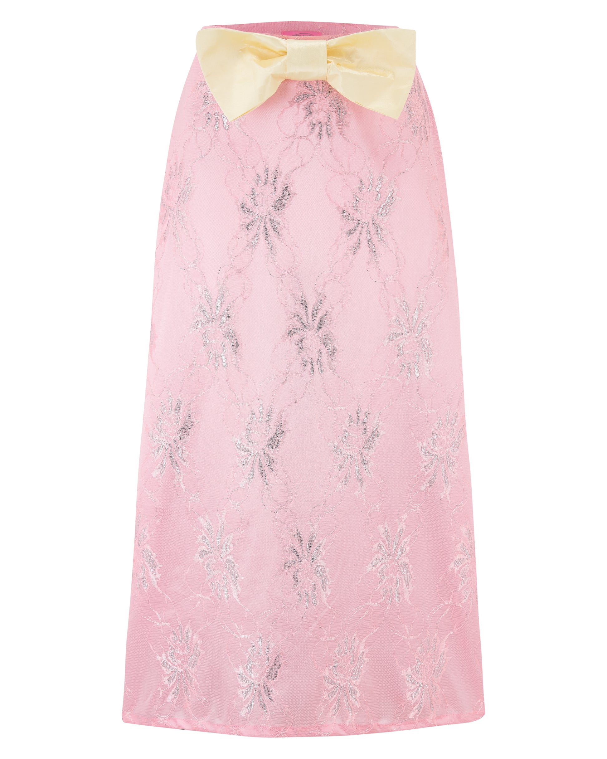 Dreamy metallic baby pink lace midi skirt silhouette with lemon yellow silk bow detail. Romantic pink lace with metallic silver design, with lemon yellow silk bow detail, which can be worn at front or backwaist, fastened with side invisible zip. Created over 5 hours, using locally sourced luxury fabrics, each order is handmade with love at Delta HQ, London by Francesca Newman.