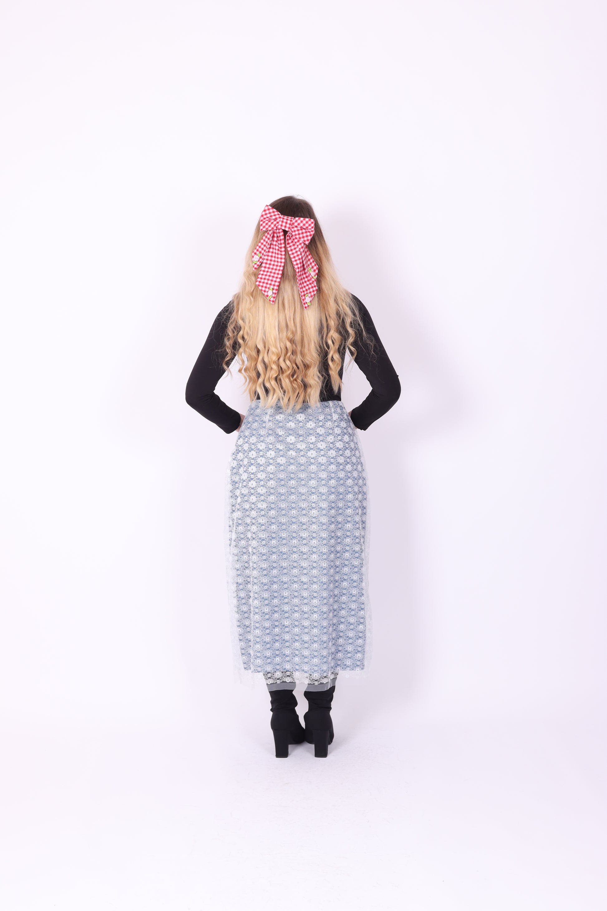 LUCIANA ✧ Denim + White Lace + Red Gingham Bow Long Skirt