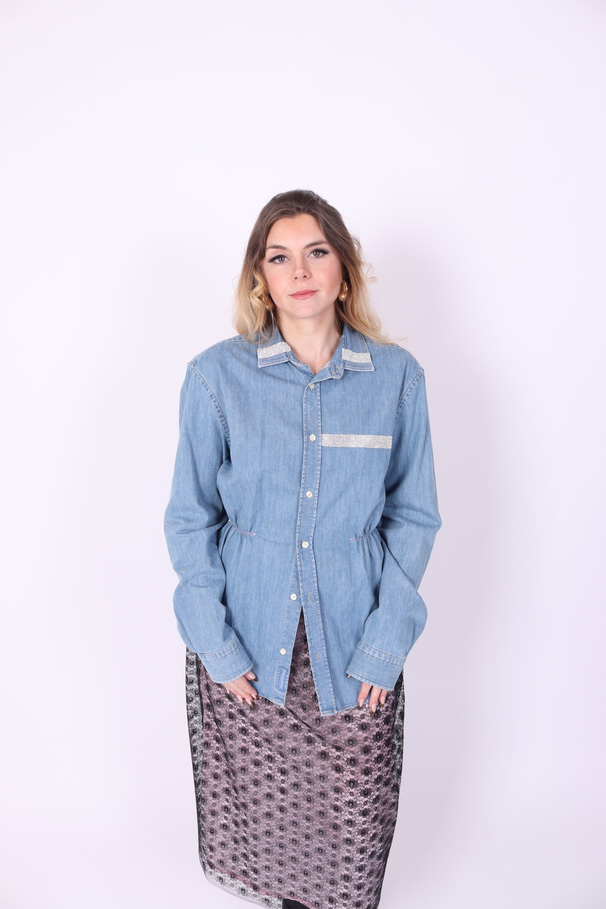 Delta Of Phoenix rework shirt in heavy mid tone denim with beaut diamante detail on left breast and collar. One of a kind rework preloved shirt, soft cotton with pink topstitch detail at waist. Created using locally sourced luxury fabrics, each shirt is one of a kind, unique and resewn with love at Delta HQ, London by Francesca Newman.✧ FULL SHIRT MEASUREMENTS WITH BUTTONS DONE UP: BUST - 48' || WAIST - 44' || HIP - 46'