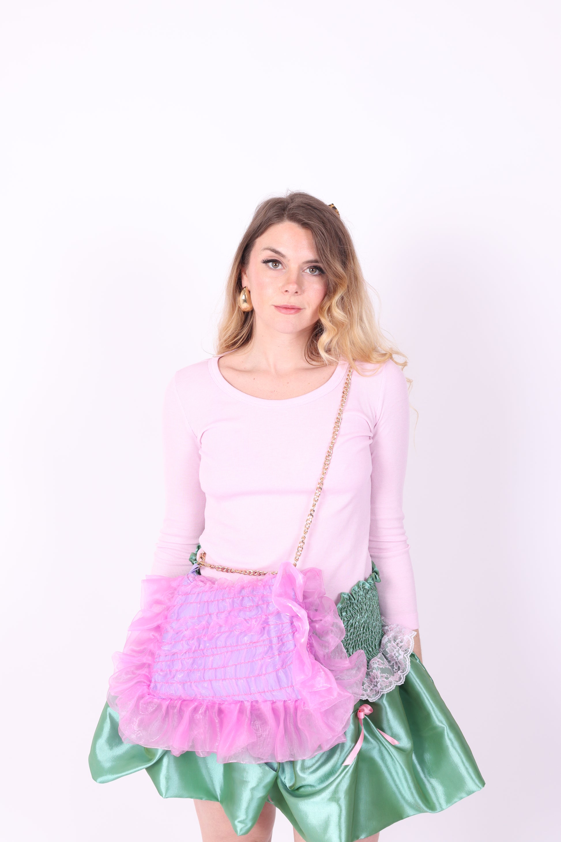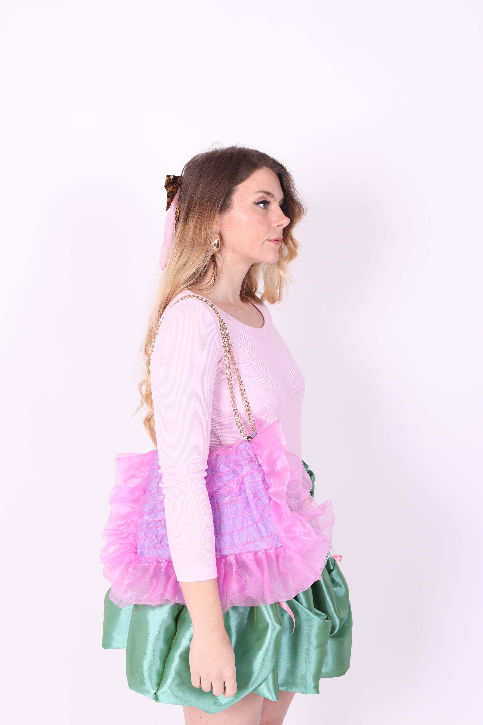 The most beautiful luxury Presley ruffle handbag in size 33', created in luxury cerise pink organza lined in pink taffeta, with organza shirred ruffle texture. Fully lined in pink, trapezoid structure inbuilt. Dreamy detachable gold plated chain handle, which can be worn both long, short and as a divine clutch. Zip, popper and metal feet base for true luxury & longevity. Created over 7 hours, using locally sourced luxury fabrics, each order is handmade with love at Delta HQ, London by Francesca Newman.