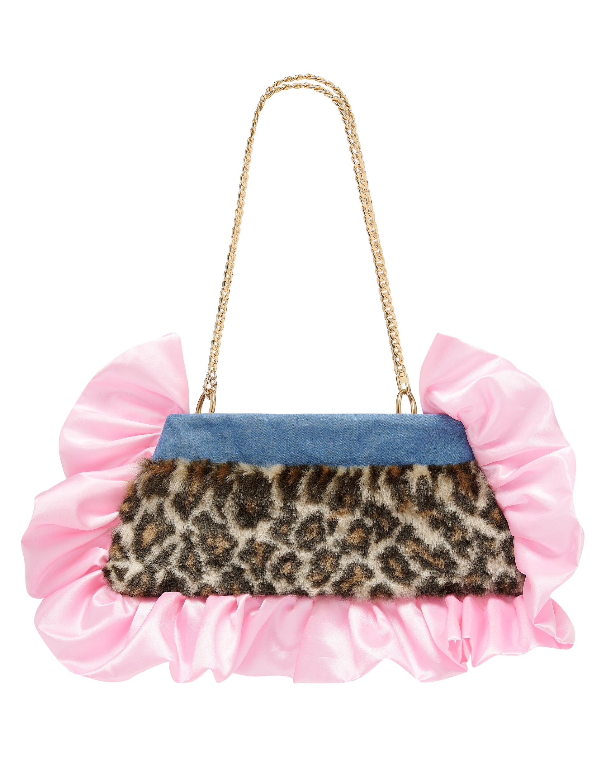 The most beautiful luxury Presley ruffle Pochette handbag, created in luxury leopard print faux fur, denim and baby pink taffeta. Fully lined in pink, trapezoid structure inbuilt. Dreamy detachable gold plated chain handle, which can be worn both long, short and as a divine clutch. Zip, popper and metal feet base for true luxury & longevity. Created over 7 hours, using locally sourced luxury fabrics, each order is handmade with love at Delta HQ, London by Francesca Newman.