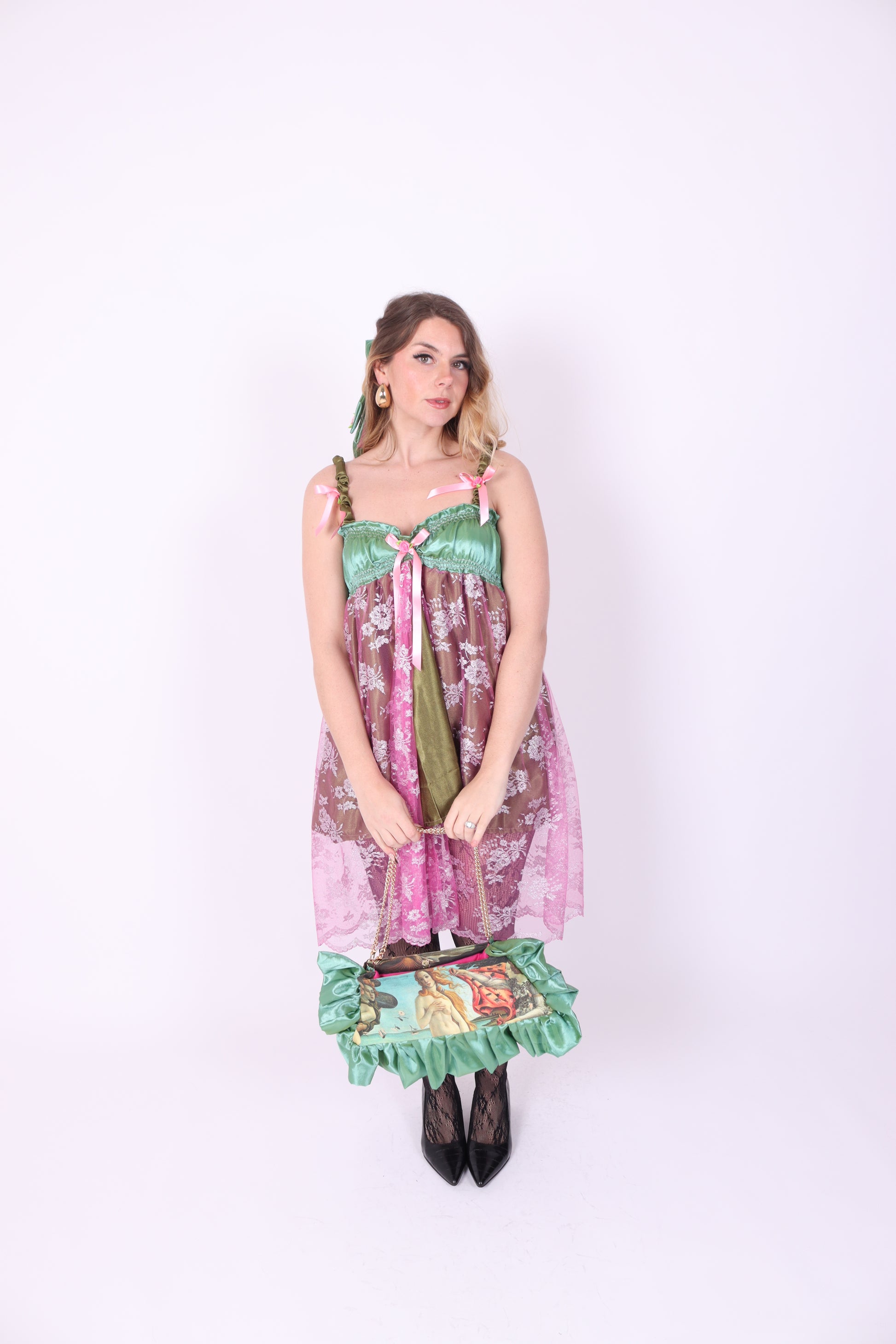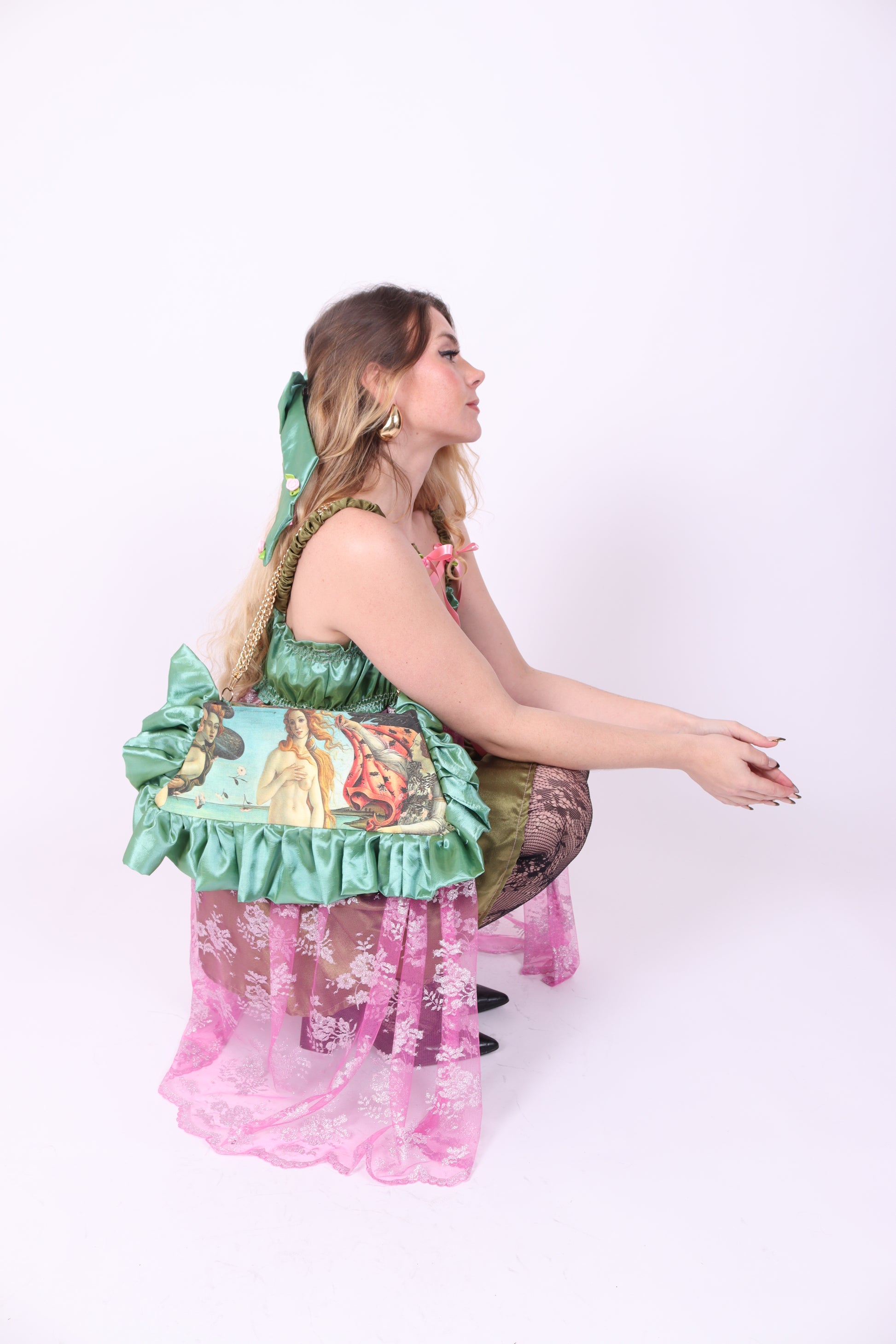 The most beautiful luxury Presley ruffle Pochette handbag, created in luxury pistachio taffeta and Venus inspired canvas. Fully lined in pink, trapezoid structure inbuilt. Dreamy detachable gold plated chain handle, which can be worn both long, short and as a divine clutch. Zip, popper and metal feet base for true luxury & longevity. Created over 7 hours, using locally sourced luxury fabrics, each order is handmade with love at Delta HQ, London by Francesca Newman.