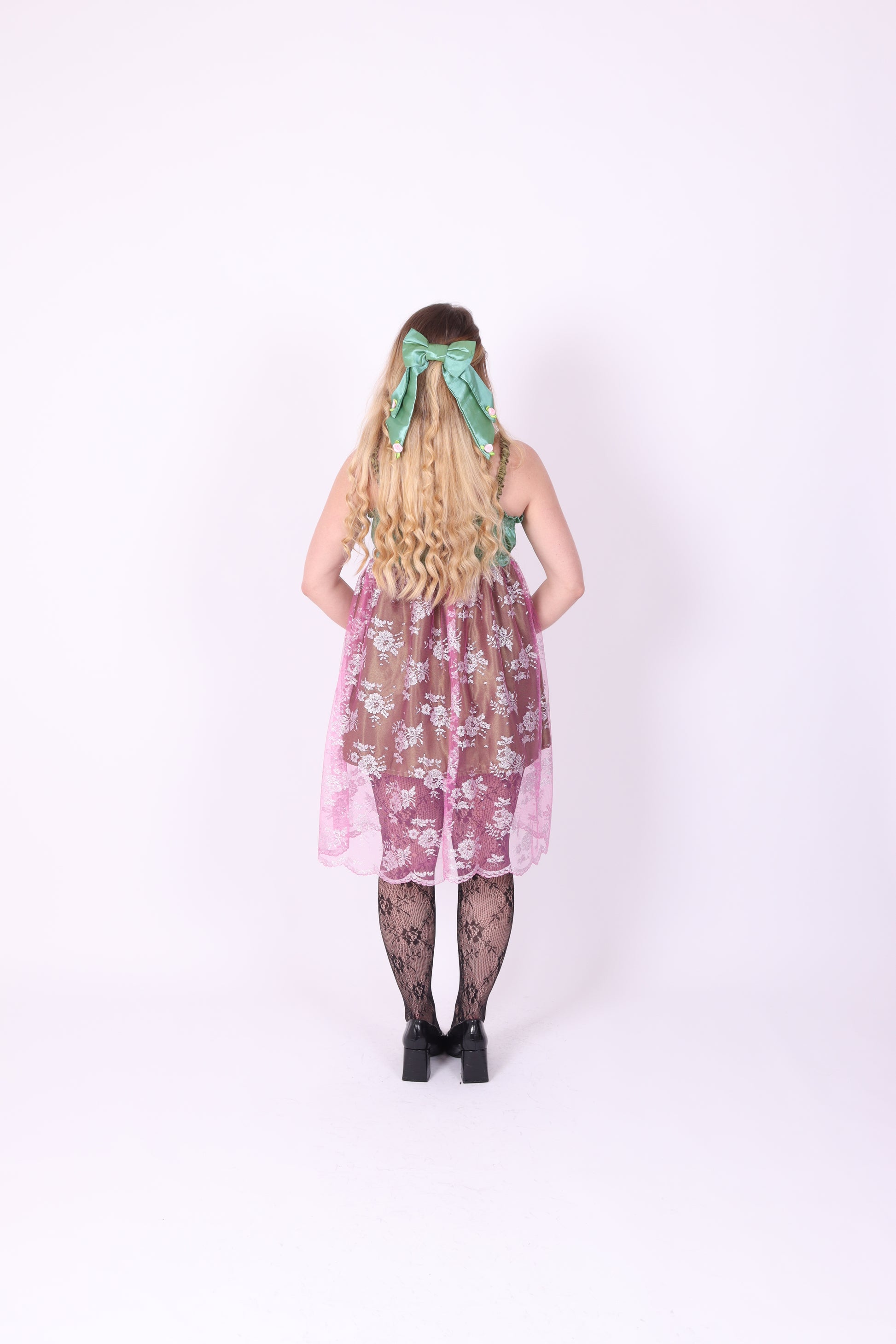 Luxury pistachio green taffeta bust, sage green skirt lining with metallic pink lace overlay. Elasticated sage green straps with pink bow detail and rosettes on strap and bust. Babydoll silhouette with ruched bodice. Created over 6 hours, using locally sourced luxury fabrics, each order is handmade with love at Delta HQ, London by Francesca Newman.